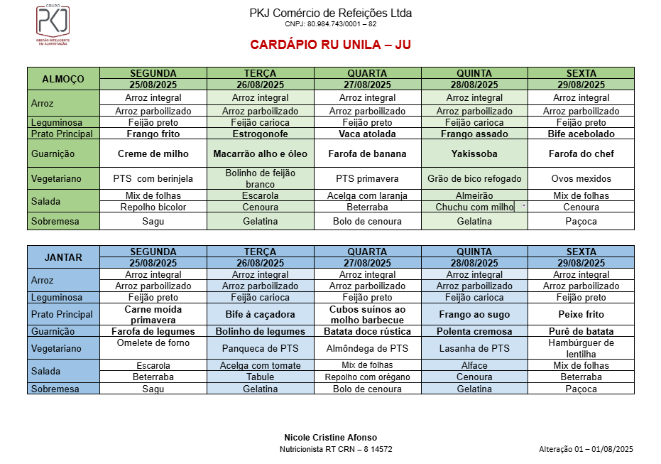 Cardápio Restaurante Universitário JU - 25/08/2025 à 29/08/2025