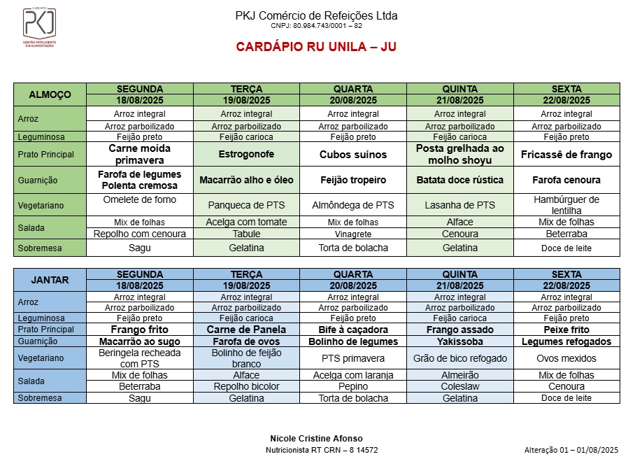 Cardápio Restaurante Universitário JU - 18/08/2025 à 22/08/2025