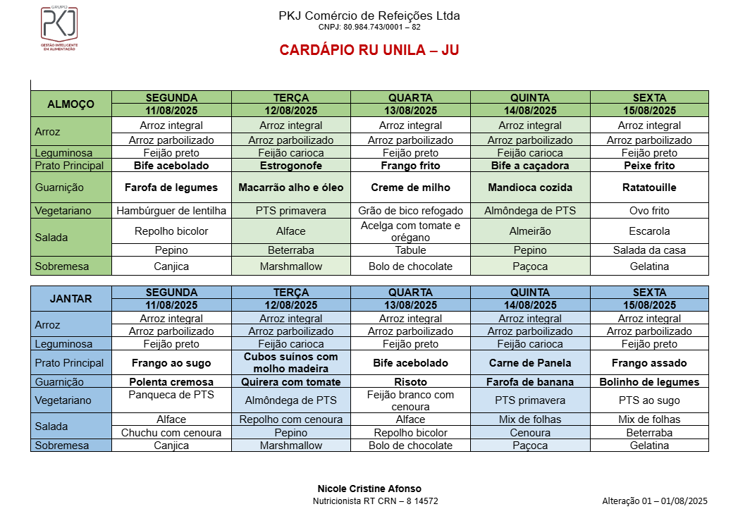 Cardápio Restaurante Universitário JU - 11/08/2025 à 15/08/2025