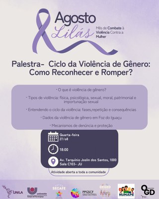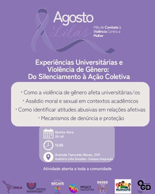 - Nos dias 27 e 28 de agosto, a UNILA promove dois encontros em referência ao mês de combate à violência contra as mulheres. Atividades são abertas a toda a comunidade.