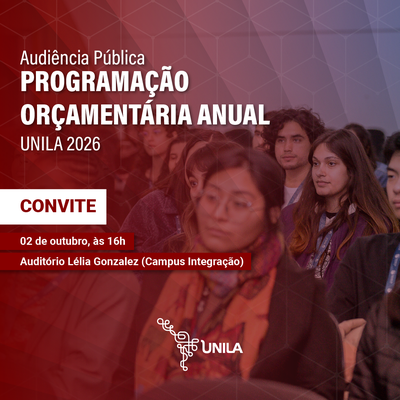 No dia 2 de outubro, das 16h às 17h30, no Auditório Lélia Gonzalez, será realizada audiência pública para discutir a proposta orçamentária da UNILA para o ano de 2026.