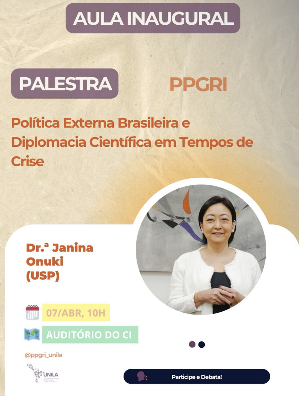A conferência será ministrada pela Profª Drª Janina Onuki @janonuki, da Universidade de São Paulo. O tema será: Política Externa Brasileira e Diplomacia Científica em Tempos de Crise. Ocorrerá no dia 07 de abril, às 10h, no Auditório Lélia Gonzalez (CI).