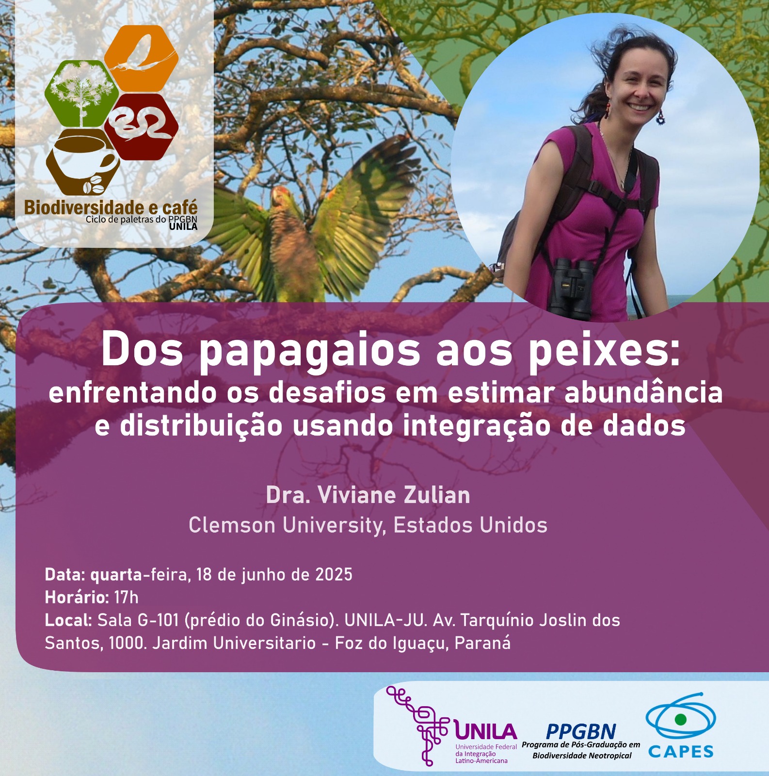 O Ciclo de palestras "Café e Biodiversidade" terá mais uma edição no dia 18 de junho, às 17h, na Unidade Jardim Universitário (sala G-101). A convidada desta edição é Viviane Zulian, da Clemson University (EUA), que ministrará a palestra “Dos papagaios aos peixes: enfrentando os desafios em estimar abundância e distribuição usando integração de dados”.