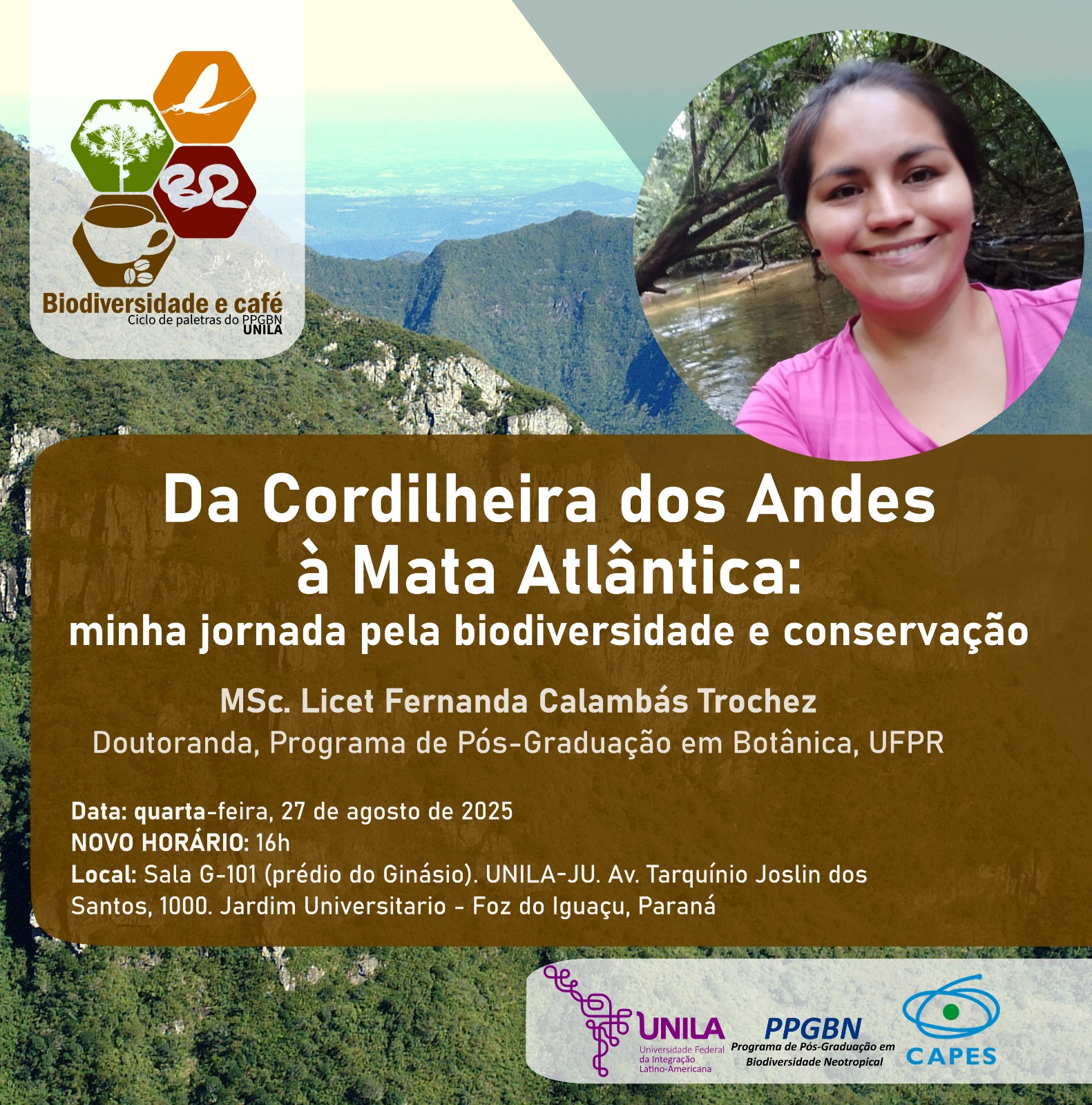 - A palestra será ministrada por Licet Fernanda Calambás Trochez, egressa da UNILA e doutoranda em Botânica na UFPR, e terá início às 16h, em novo horário.
