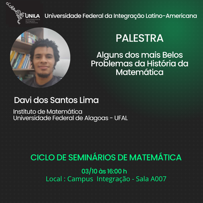 - A palestra “Alguns dos mais belos problemas da história da Matemática” será ministrada pelo professor Davi dos Santos Lima (UFAL), no dia 3 de outubro, às 16h, no Campus Integração.