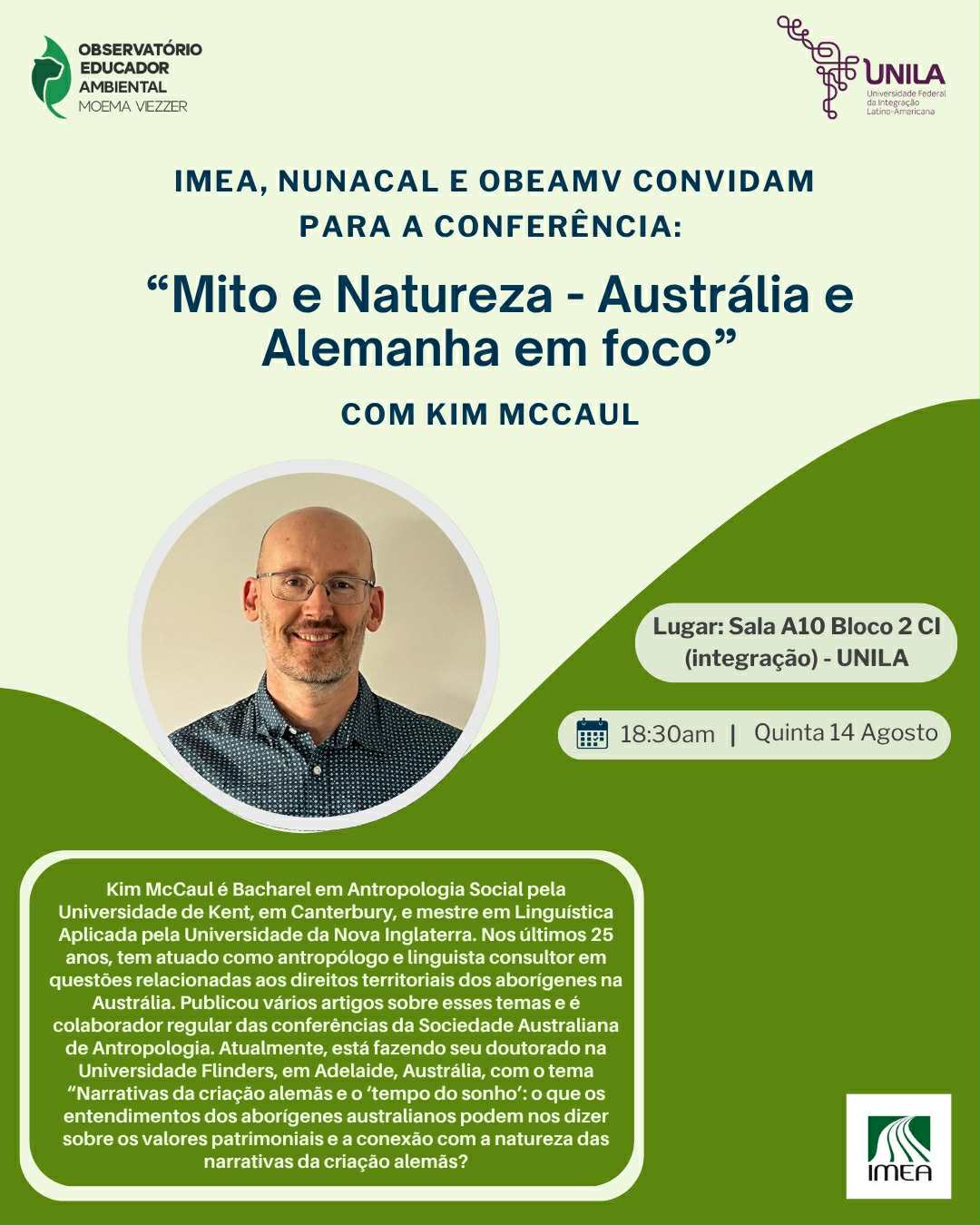 A conferência “Mito e Natureza: Austrália e Alemanha em foco” será realizada no dia 14 de agosto, às 18h30, no Campus Integração (Bloco 2 - sala A10), e terá como ministrante o antropólogo e linguista Kim McCaul.