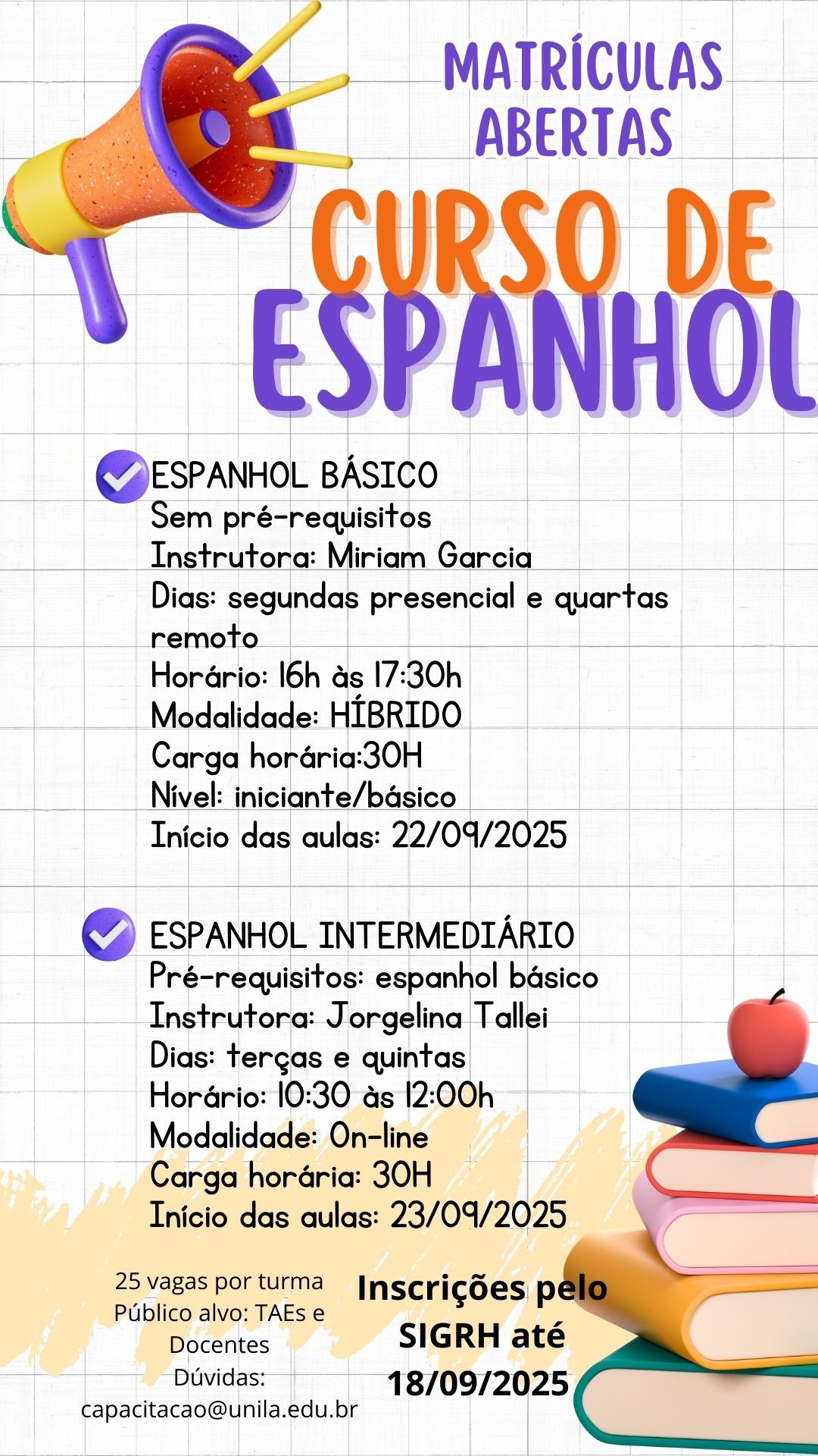 - Capacitação oferece turmas para Espanhol básico e intermediário. As inscrições foram prorrogadas e podem ser feitas pelo SIGRH.