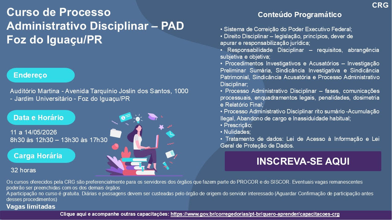 - UNILA promove curso presencial de Processo Administrativo Disciplinar, em parceria com a CGU. Atividade será realizada em maio, e as inscrições já estão abertas.