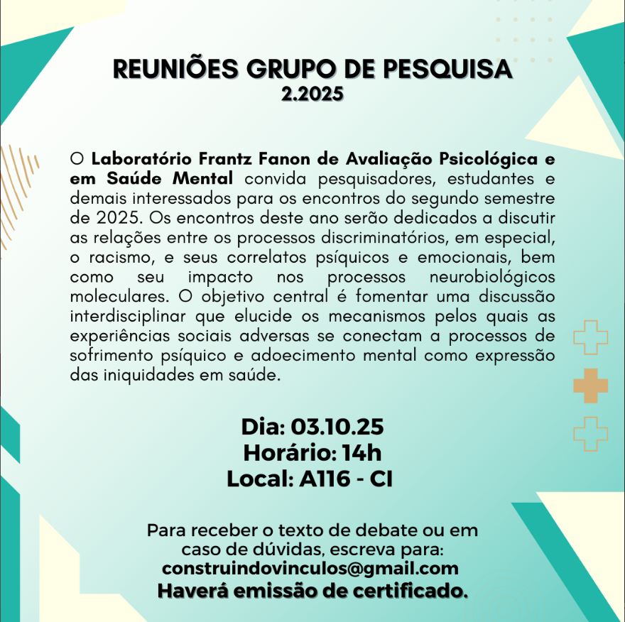 O Laboratório Frantz Fanon de Avaliação Psicológica e em Saúde Mental convida pesquisadores, estudantes e demais interessados para os encontros do segundo semestre de 2025. O primeiro encontro será realizado no dia 3 de outubro, às 14h, no Campus Integração (sala A116).