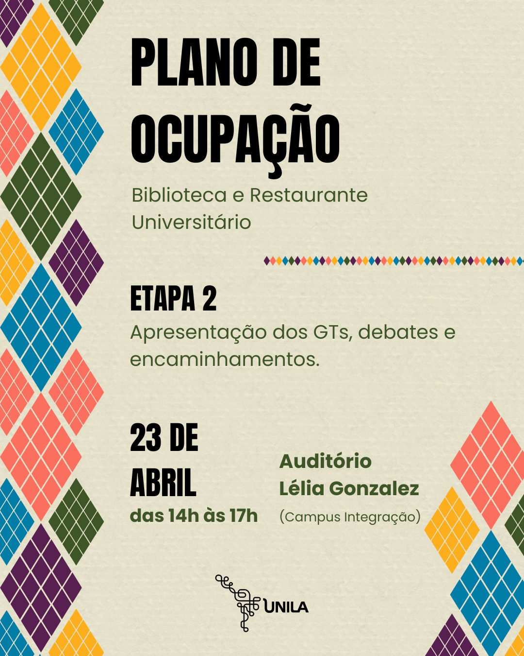 - Oficina referente à etapa 2 do Plano de Ocupação das Unidades da UNILA será realizada no dia 23 de abril, no Campus Integração. Atividade é aberta a toda a comunidade acadêmica.