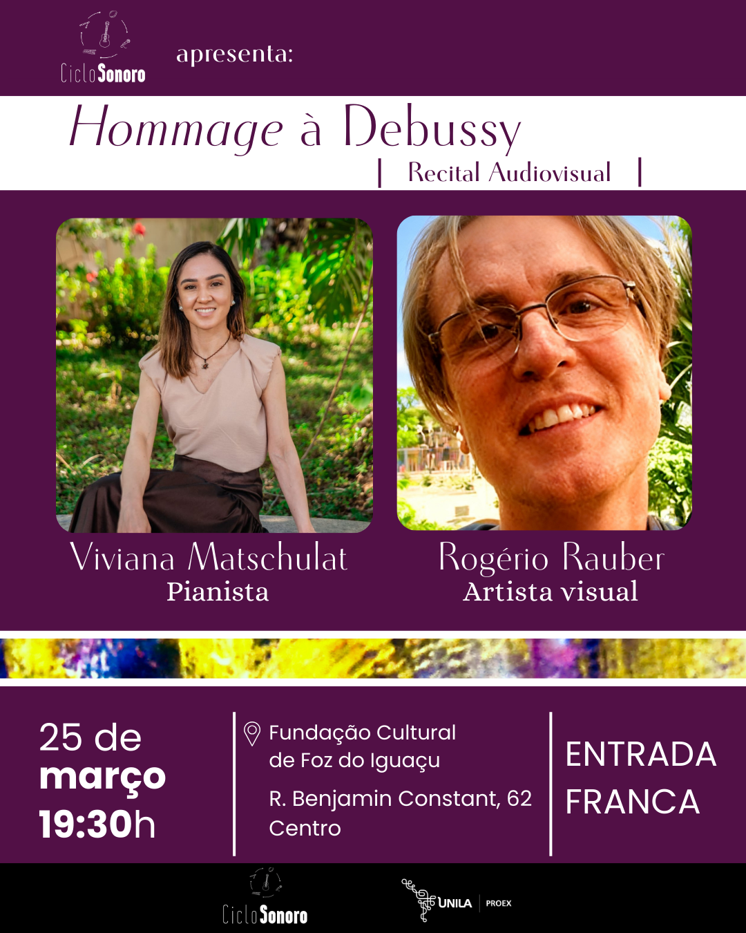 O projeto de extensão Ciclo Sonoro apresenta o recital "Hommage a Debussy - Recital audiovisual", com a pianista Viviana Matschulat e o artista visual Rogério Rauber. O evento acontecerá na Fundação Cultural de Foz do Iguaçu (Rua Benjamin Constant, 62 - Centro), no dia 25 de março ás 19h30 com entrada franca.
