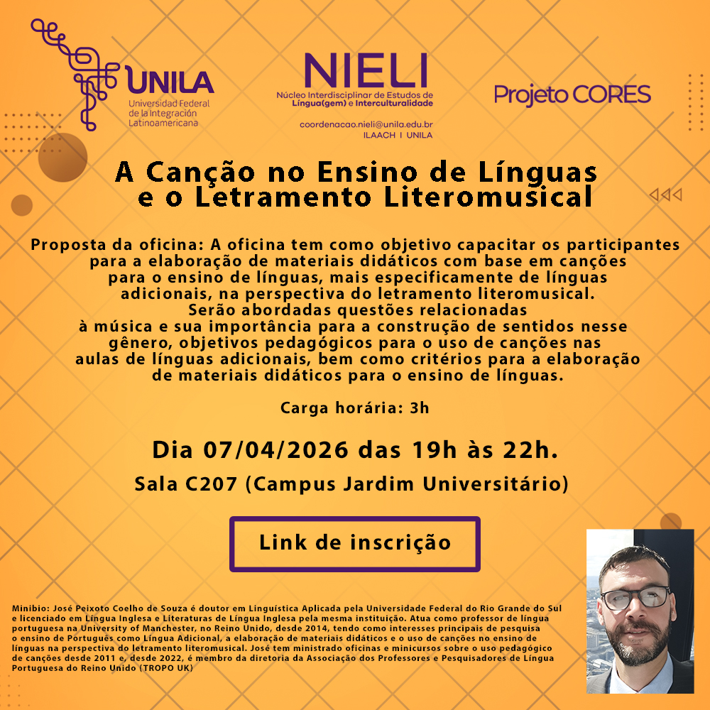 O Núcleo Interdisciplinar de Estudos de Linguagem e Interculturalidade (NIELI), com apoio do projeto de extensão Compreensão e Produção Oral e Escrita na Universidade (CORES), promovem a oficina “A Canção no Ensino de Línguas e o Letramento Literomusical”. A mesma será ofertada no dia 07/04, na sala C207 do Jardim Universitário, às 19h com 3h de duração.