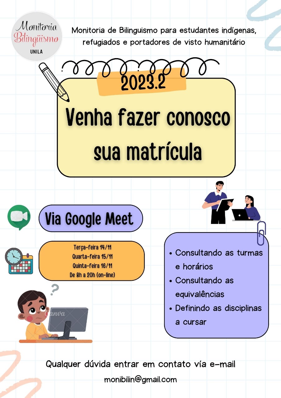 Na próxima terça (14), quarta (15) e quinta-feira (16), data em que deverão ser efetivadas as matrículas, a UNILA irá oferecer uma oficina para a realização da matrícula online. Promovida pela área de Bilinguismo - Assessoria em Português e Espanhol da Monitoria de Ensino para Promoção da Permanência de Estudantes Indígenas, Refugiados e Portadores de Visto Humanitário da Universidade, a oficina será ofertada das 8h às 20h. Neste período, a equipe estará disponível para ajudar os alunos a consultar as turmas e horários; consultar as equivalências; definir as disciplinas a cursar; e muito mais!