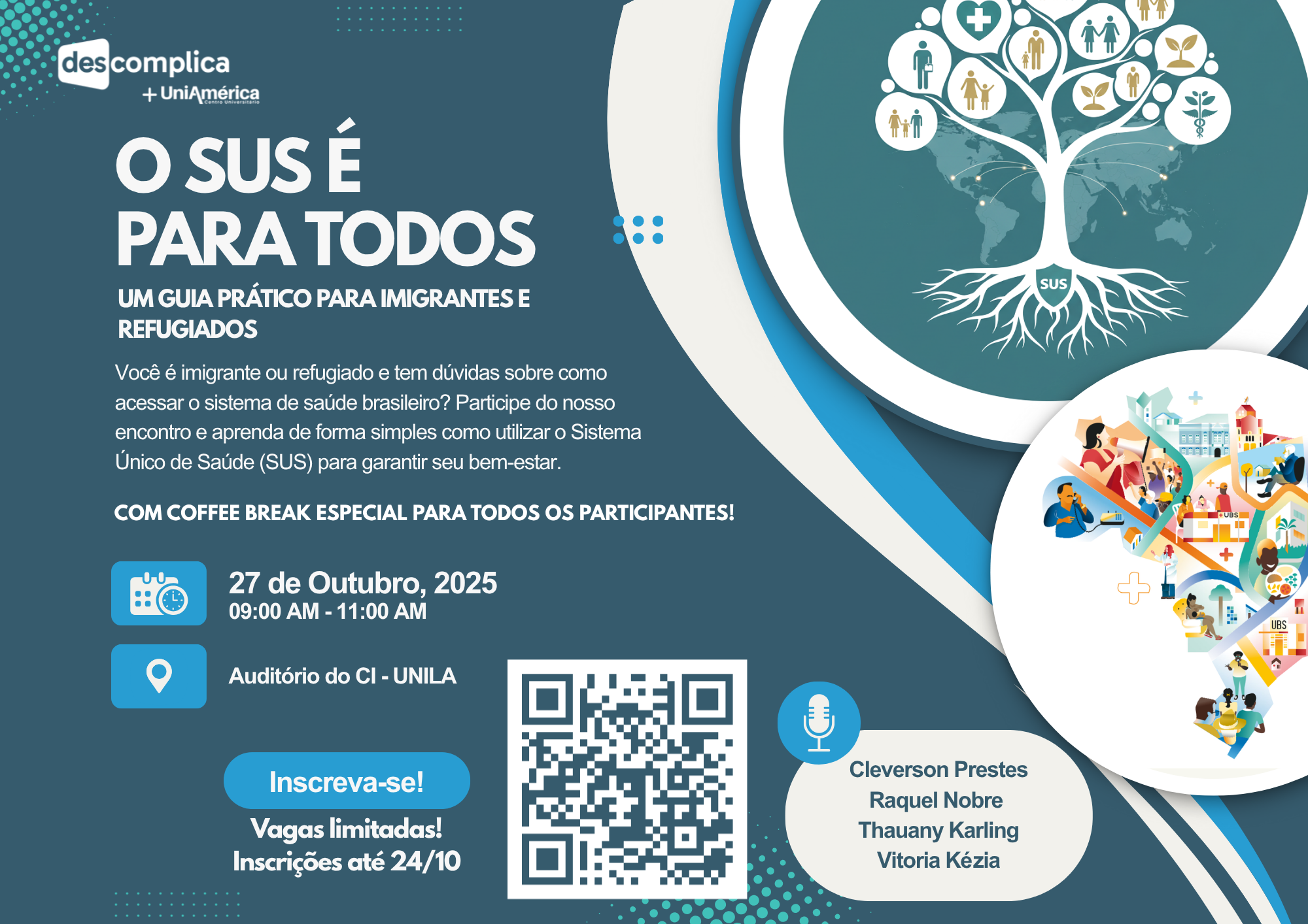No dia 27 de outubro, das 9h às 11h, será realizada a palestra "O SUS é para todos", voltada para imigrantes e refugiados. A atividade acontece no auditório do Campus Integração e tem como objetivo apresentar informações sobre o funcionamento do Sistema Único de Saúde (SUS) e o acesso aos serviços disponíveis no Brasil.