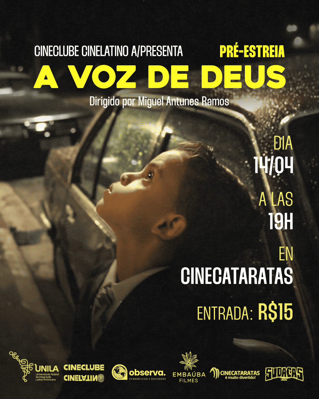 O filme “A Voz de Deus” (2025), do diretor Miguel Antunes Ramos, chega em pré-estreia ao Cineclube Cinelatino este mês. Estreando nos cinemas das principais capitais do país na quinta-feira, dia 16, o Cineclube Cinelatino se antecipa, e exibe o premiado documentário no dia 14 de abril, às 19 horas, no Cinecataratas (ingressos a R$ 15,00), em Foz do Iguaçu. A sessão é fruto da parceria entre o Cineclube Cinelatino, o Observatório Evangélicos e Sociedade da UNILA, o Cinecataratas, a distribuidora Embaúba Filmes e o Sudacas Bar.