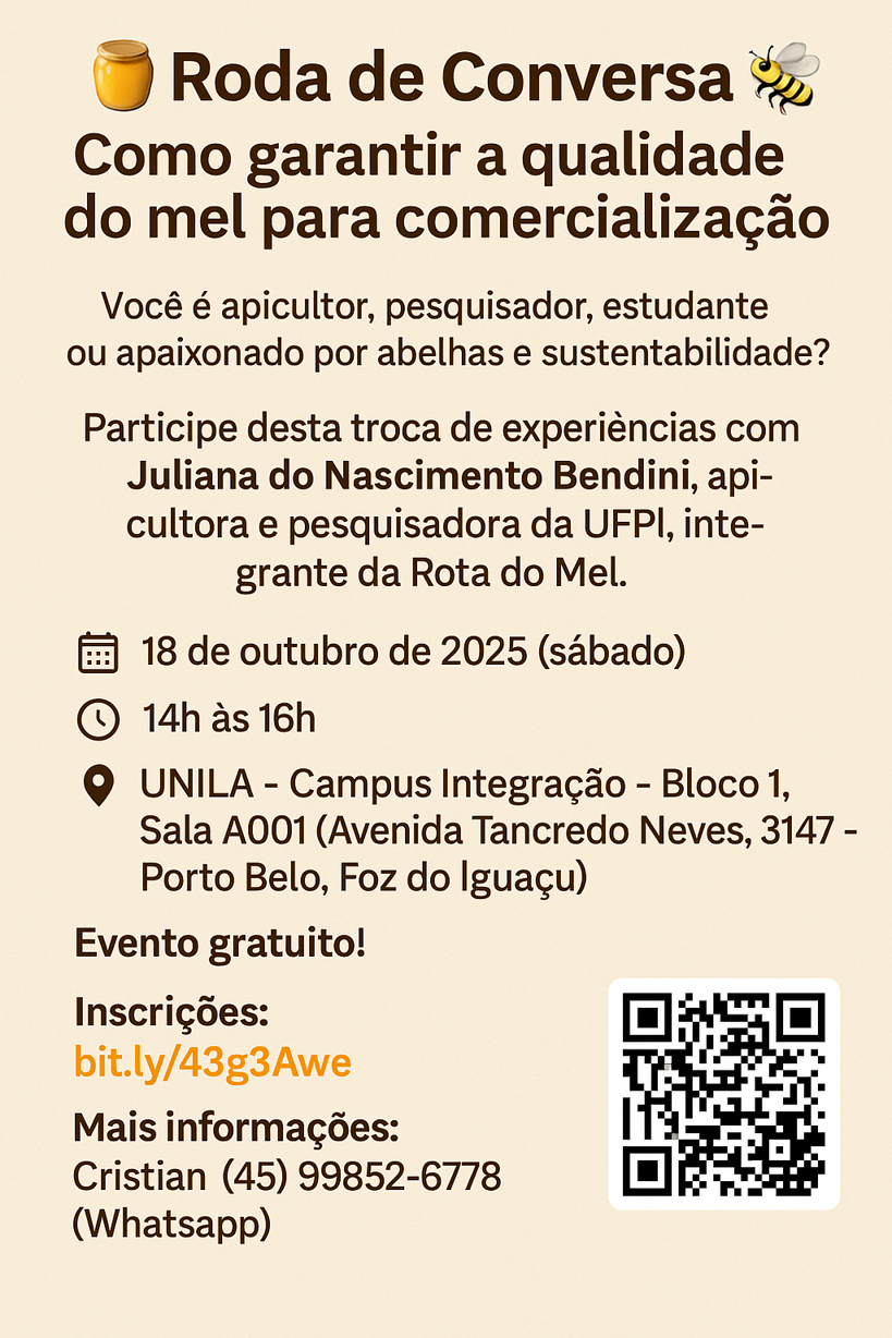 - https://portal.unila.edu.br/eventos/roda-de-conversa-como-garantir-a-qualidade-do-mel-para-comercializacao