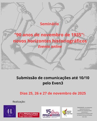 De 25 a 27 de novembro, o Programa de Pós-Graduação em História da UNILA, o Laboratório de Pesquisa, Estado e Poder da Unioeste e o Programa de Pós-Graduação em História da UFMA promovem o Seminário "90 anos de novembro de 1935". O evento será realizado de forma online.