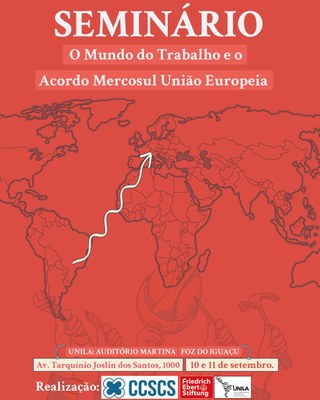 O Seminário "O mundo do trabalho e o Acordo Mercosul-União Europeia" será realizado nos dias 10 e 11 de setembro, no Auditório da UNILA, no Jardim Universitário.