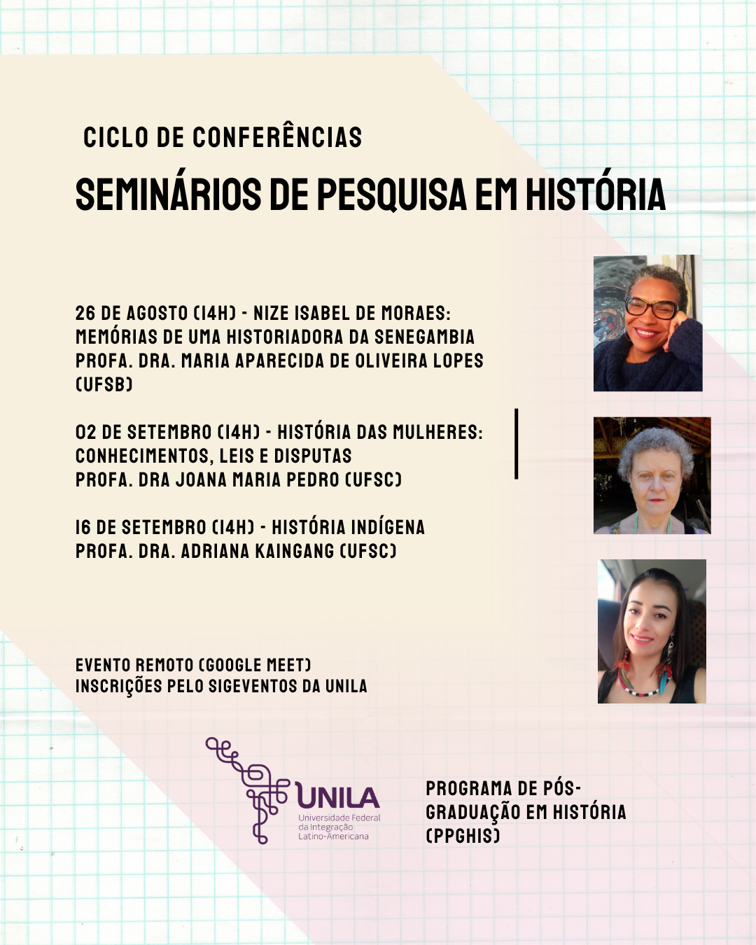 Nos dias 26 de agosto, 2 de setembro e 16 de setembro, sempre às 14h, o Programa de Pós-Graduação em História da UNILA promove os Seminários de Pesquisa em História.