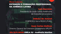 16h às 18h: Mesa-redonda - "Extensão e Formação profissional na América Latina", com Luis Barreras (Presidente da União Latino-Americana de Extensão Universitária), Débora do Amaral (FORPROEX-Sul e PROEC/FURG), e Juan Carlos Molinas (Director General de Extensión Universitaria UPE/PY).