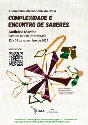 I Seminario Internacional del IMEA 09 a 11 de octubre de 2023 El evento promovió un diálogo interepistémico entre profesoras y profesores de la UNILA y maestros y maestras de los saberes tradicionales de diferentes territorios de Brasil, así como con rectores y rectoras de la Red de Universidades Interculturales Indígenas y Comunitarias de Abya Yala (RUIICAY), provenientes de Nicaragua, Colombia, Ecuador y Bolivia. También estuvieron presentes directores de tres Institutos de Estudios Avanzados de Brasil (UNB, UFMG y UFRGS), el Director de Proyectos de la Fundación Araucaria, y el profesor José Jorge de Carvalho, de la UNB, coordinador brasileño del Encuentro de Saberes del país. Página del evento: https://sig.unila.edu.br/eventos/public/evento/IMEASABERES/principal/view |