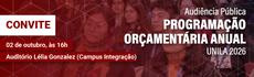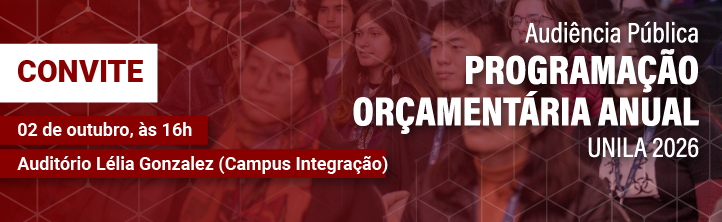A audiência pública que visa debater a proposta orçamentária da UNILA para o próximo ano ocorre nesta quinta-feira (2), às 16h, no Auditório Lélia Gonzalez (Campus Integração). Organizada pela Reitoria e pela Pró-Reitoria de Planejamento, Orçamento e Finanças (PROPLAN), a atividade é aberta a toda a comunidade acadêmica e compõe o cronograma do Orçamento Participativo da Universidade. Confira os temas que serão abordados: