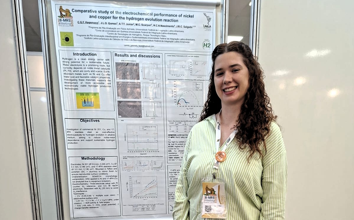 A mestranda Camila Gabrieli Feck Hagemann, do Programa de Pós-Graduação em Física Aplicada (PPGFISA) da UNILA, participou do 23º Encontro da Sociedade Brasileira de Pesquisa em Materiais, realizado em Salvador/BA, no início deste mês. Durante o evento, a estudante apresentou os resultados da pesquisa que vem desenvolvendo na sua dissertação. Nesse trabalho, ela faz um estudo comparativo do desempenho eletroquímico do níquel e do cobre para a reação de evolução do hidrogênio (acesse o resumo). A participação de Camila no encontro foi possibilitada com o auxílio de recursos do Programa de Apoio à Pós-Graduação (Proap/Capes) 2025.