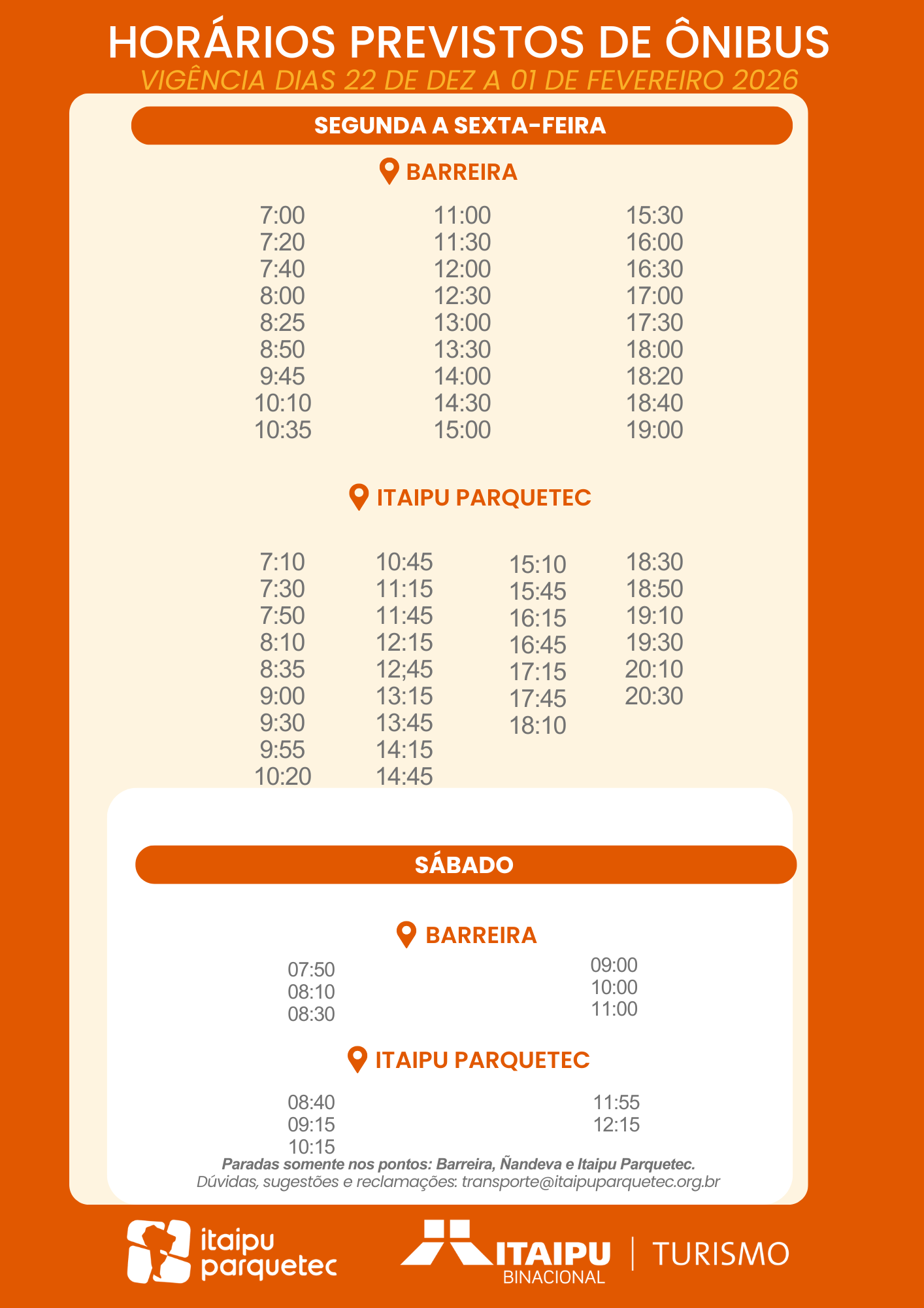 A Divisão de Transporte (DITRAN) informa que o serviço de transporte interunidades funcionará em horário reduzido a partir do dia 22 de dezembro. A tabela de horários pode ser consultada na página da PROAGI. Também a partir de 22 de dezembro, os horários do transporte interno do Itaipu Parquetec sofrerão alterações por conta da redução do número de passageiros neste período. Confira.