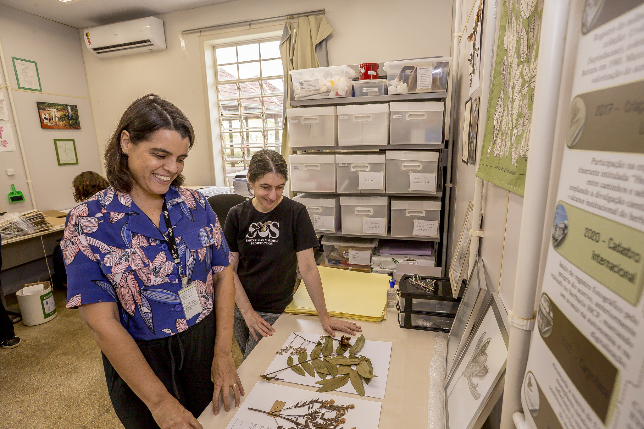 Curadoras do herbário Evaldo Buttura, à esquerda a professora Laura Cristina Pires Lima, ao fundo a professora Giovana Secretti Vendruscolo (Foto: Moisés Bonfim/SECOM-UNILA)