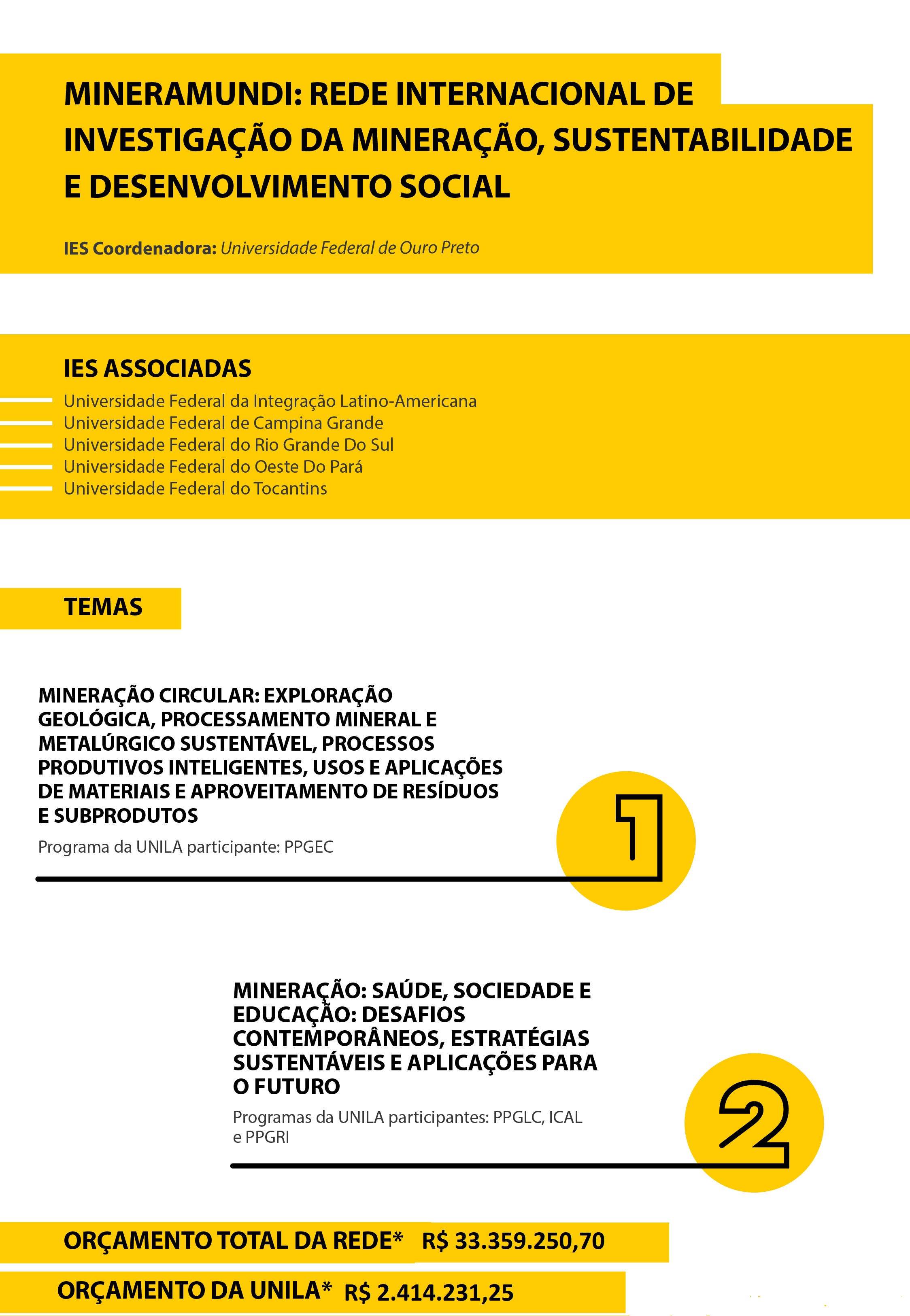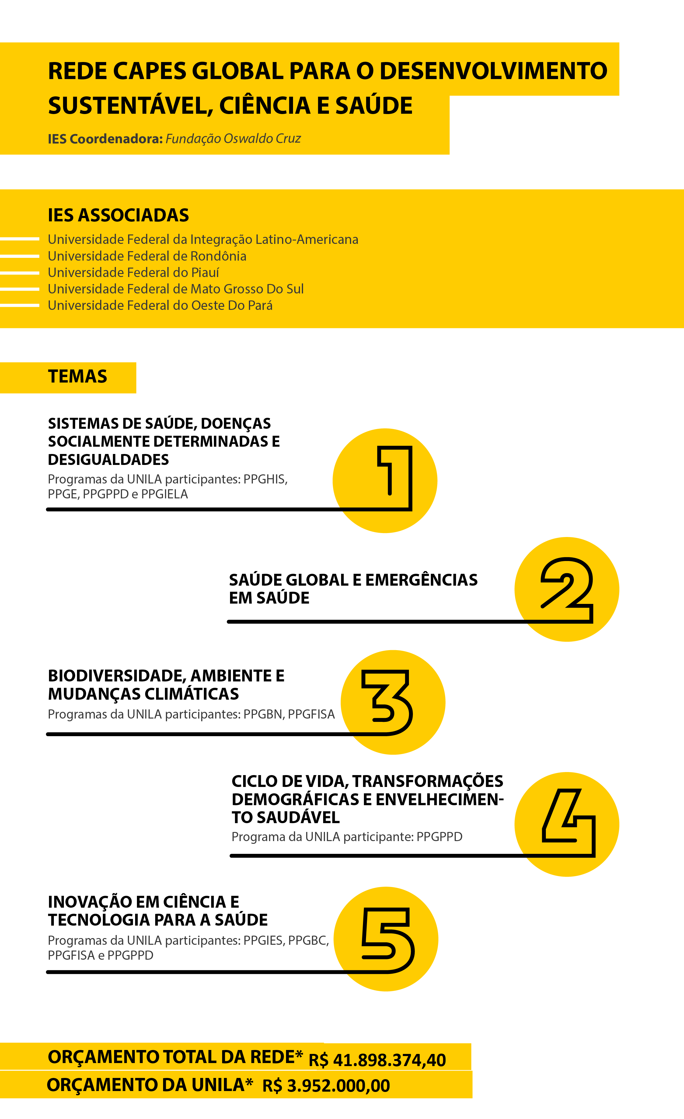 A UNILA participa de duas iniciativas: Rede Capes Global para o Desenvolvimento Sustentável, Ciência e Saúde, coordenada pela Fundação Oswaldo Cruz; e MineraMundi - Rede Internacional de Investigação da Mineração, Sustentabilidade e Desenvolvimento Social, coordenada pela Universidade Federal de Ouro Preto (UFOP).