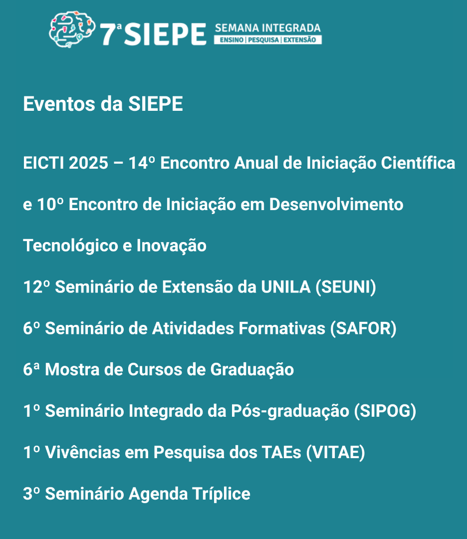 A Semana Integrada de Ensino, Pesquisa e Extensão (SIEPE), que está em sua 7ª edição, tem como novidades a distribuição das atividades em duas unidades da UNILA e a inclusão de eventos em sua grade de programação. O evento será realizado de 10 a 14 de novembro. Maior evento acadêmico da UNILA, a SIEPE deste ano terá como tema “Planeta Água: Cultura oceânica para enfrentar as mudanças climáticas no meu território”, seguindo o tema da Semana Nacional de Ciência e Tecnologia.
