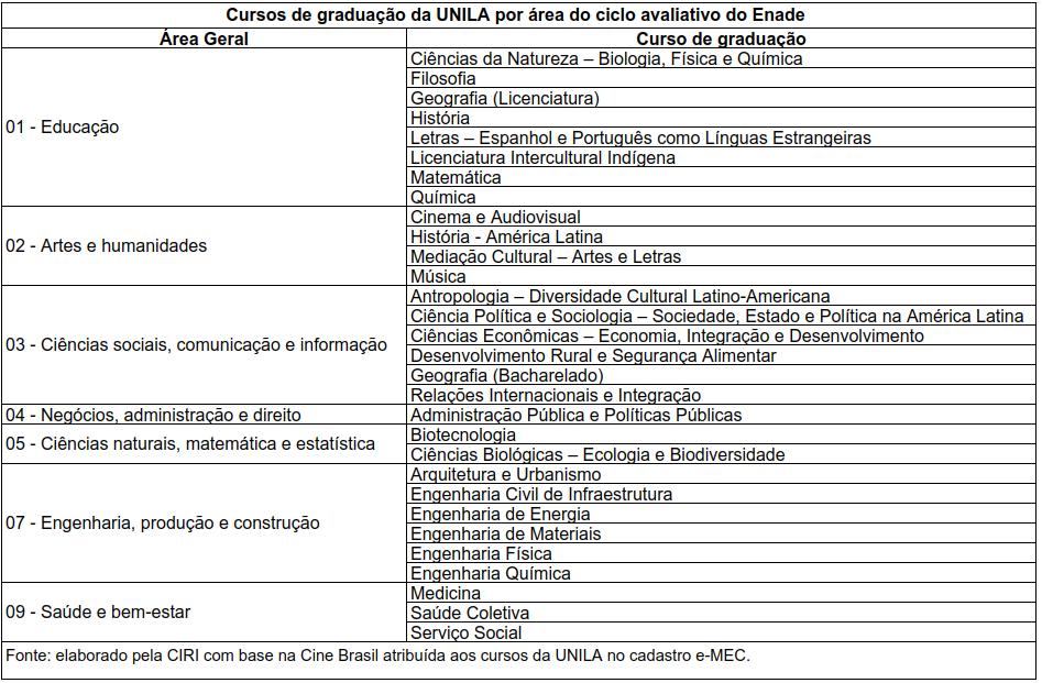 Cursos de Graduação da UNILA a serem avaliados no Enade 2026, conforme a Portaria MEC nº 276/2026: