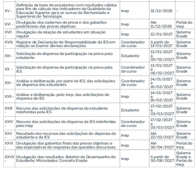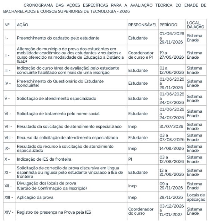 O Enade 2026 cumprirá o seguinte cronograma à Avaliação Teórica, conforme o Edital MEC/Inep nº 49/2026: