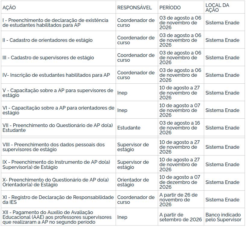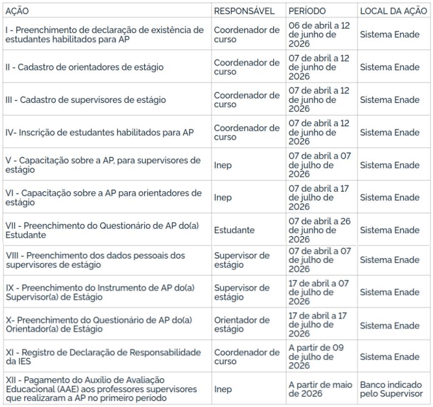 O Enade 2026 cumprirá o seguinte cronograma à Avaliação da Prática, conforme o Edital MEC/Inep nº 30/2026: