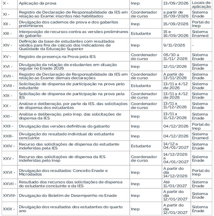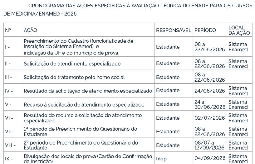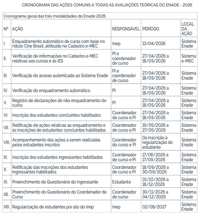 O Enade 2026 cumprirá o seguinte cronograma à Avaliação Teórica, conforme o Edital MEC/Inep nº 49/2026: