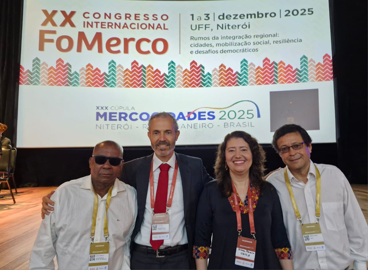 A reitora Diana Araujo Pereira participou do 20º Congresso Internacional FoMerco, realizado na Universidade Federal Fluminense, em Niterói/RJ, de 1º a 3 de dezembro. Com o tema “Rumos da Integração Regional: cidades, mobilização social, resiliência e desafios democráticos”, o encontro acadêmico preparatório para a Cúpula do Mercocidades teve como foco reforçar seu papel estratégico no diálogo entre pesquisa, políticas públicas e experiências territoriais, ajudando a compreender melhor os desafios compartilhados na região e o lugar que as universidades podem ocupar neste processo.